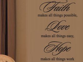 - This decal says 'Faith makes all things possible, love makes all things easy, hope makes all things work'