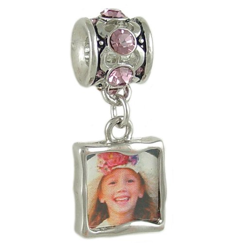 June Birthstone Bead, "Sparkling Memories - birthstone photo charms that let your love shine". This european bead charm is a great way for Mom to show off her loved ones! A two sided photo frame dangles from an antiqued silver-plated bead with hand-set pink Alexandrite Czechoslovakian crystals. Alexandrite represents the birthstone for the month of June. The silver plated bead is unthreaded and compatible with major brand Cable European Charm Bracelets, including Silverado, Ohm, Biagi and Zable. Bead is antique oxidized. For added versatility, add the photo bead charm to a chain and wear it as a pendant. We will include easy instructions for printing TWO photos to insert in the charm. Arrives gift boxed!